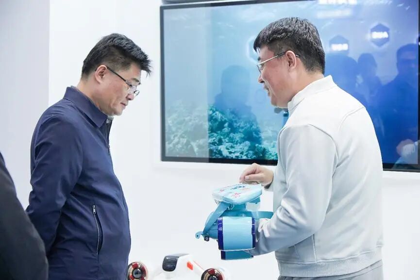 翟立新副市长一行在董事长魏建仓的陪同下,参观了深之蓝展厅。展厅内各类先进水下机器人整齐陈列,充分展示了深之蓝在海洋智能装备领域的技术实力与创新成果。在参观过程中,翟副市长详细了解了缆控水下机器人、自主水下航行器、水下滑翔机及水下助推机器人等核心产品。此次领导莅临不仅是对企业的高度重视与关怀,更是对深之蓝坚持创新、服务国家海洋战略的鼓舞。